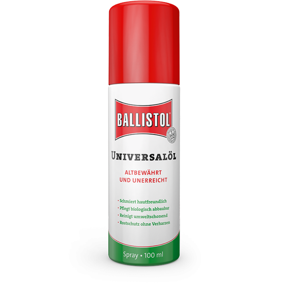 Ballistol universele olie, is al jaren “het” product voor het onderhouden van alle soorten wapens. Ballistol lost kruitresten op, reinigt en smeert alle wapen onderdelen. Heel belangrijk voor het onderhouden van een wapen is het feit dat Ballistol absoluut niet verhardt, zelfs niet na tientallen jaren, dus Ballistol garandeert dat de werking van het wapen niet wordt verhinderd door uitgeharde olie tussen de bewegende delen.