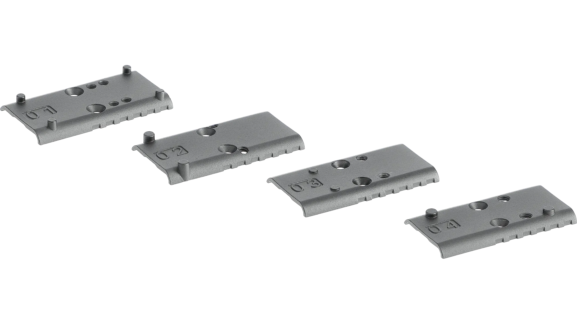 Set van 4 adapterplaten voor GLOCK luchtbuks en airsoft modellen met Modular Optic System (MOS)Maakt montage mogelijk van richtkijkers met Docter-, Trijicon-, C-More- en Leupold-voetafdruk op luchtdrukpistolen en airsoftpistolen met MOS1-standaard.